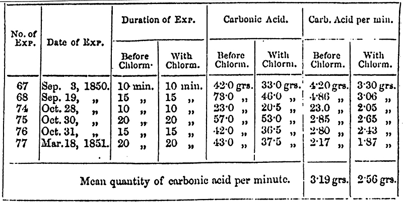 In Exp. 67, for instance, 42 grains of carbonic acid gas were absorbed by the potash whilst breathing oxygen for ten minutes before the chloroform had been inhaled, and only 33 grains during the same period, just after the inhalation of chloroform. A similar diminution of the amount of carbonic acid took place in Exp. 68.