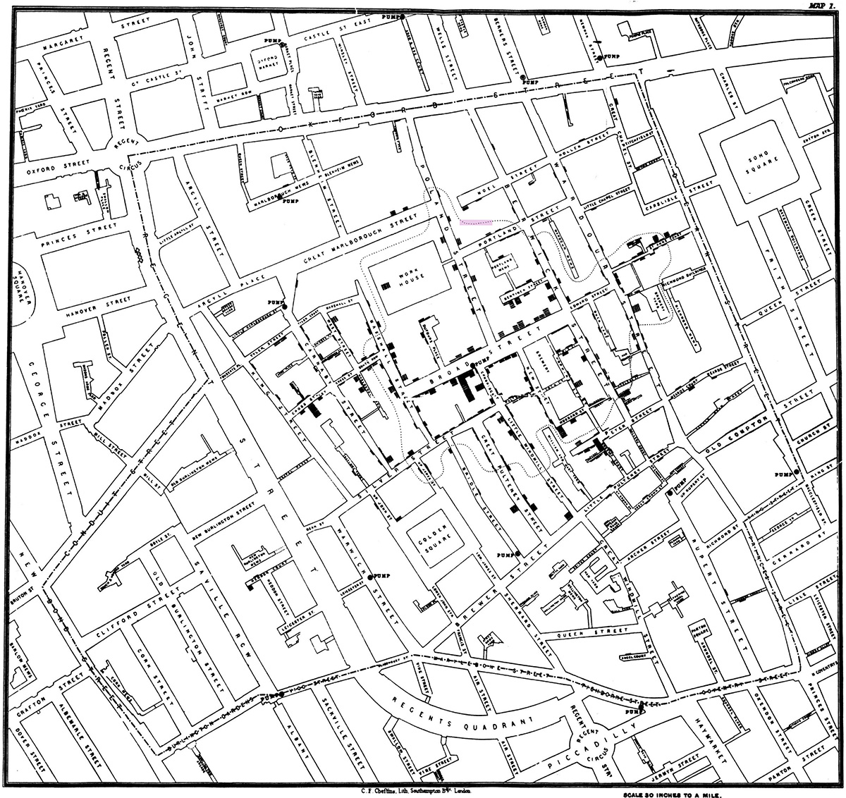The pump in Broad Street is indicated on the map, as well as all the surrounding pumps to which the public had access at the time of the outbreak of Cholera. The water of the pump in Marlborough Street, at the end of Carnaby Street, was so impure that many persons avoided using it. I found that the persons who died near this pump in the beginning of September had taken water from the Broad Street pump. The inner dotted [stippled] line on the map shows the various points which have been found by careful measurement to be at an equal distance by the nearest road from the pump in Broad Street and the surrounding pumps. If allowance be made for the circumstance just mentioned respecting the pump in Marlborough Street, it will be observed that the deaths either very much diminish, or cease altogether, at every point where it becomes decidedly nearer to go to another pump than to the one in Broad Street. At these points, I ascertained that the peope did generally go to the pump that was nearer. [the pink spot is a repair in the map due to a tear].